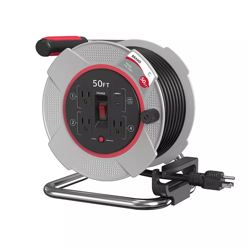 ओभरलोड सुरक्षा सुविधा र अनुप्रयोगको साथ Ningbo Kaifeng 3 आउटलेटहरू Usb2.4a प्लास्टिक कर्ड रील 50ft
